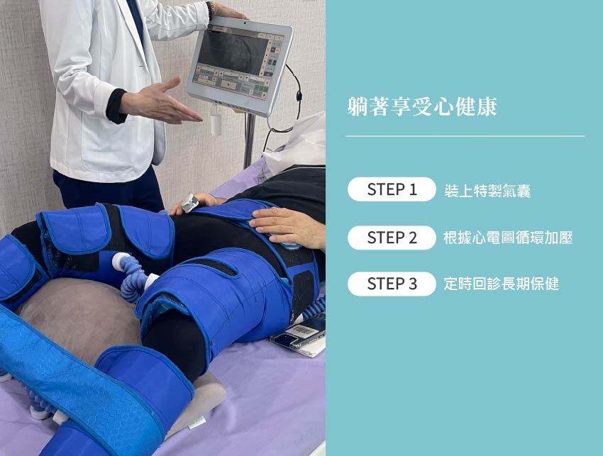 療程中,患者平躺於專用治療床,並在 小腿、大腿與臀部,包覆三段充氣式氣囊。氣囊會依據心電圖(ECG)