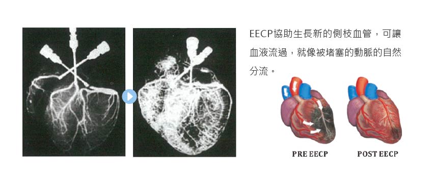 從影像中可清楚看到,治療前血流有限,而經過 EECP 後,血管網絡明顯增加、血液循環更順暢,