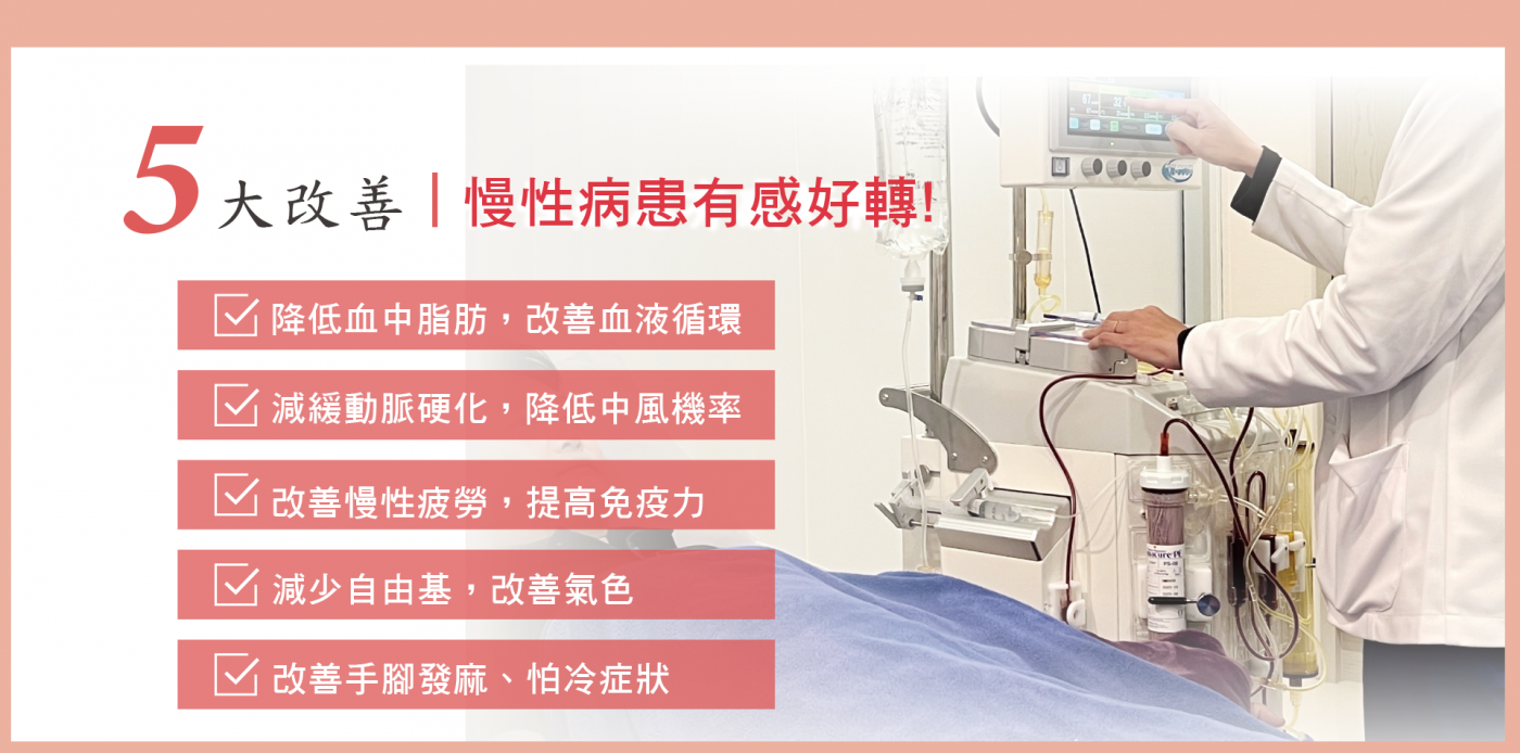 血漿分離術能有效去除血中的大分子物質,包括低密度膽固醇、纖維蛋白原、脂蛋白、巨球蛋白,也就是會引起動脈硬化的重要危險因子;除此之外,還能大幅降低血液黏稠度,明顯改善周邊微細血管循環。