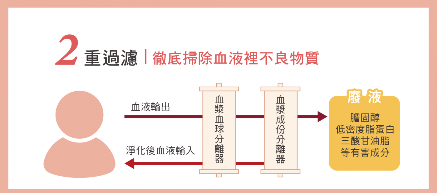 先將血液分離為血球與血漿,血球直接回到人體,利用半透膜技術清除血漿中不良因子,最後將淨化過的血漿送返人體,達到血液淨化。